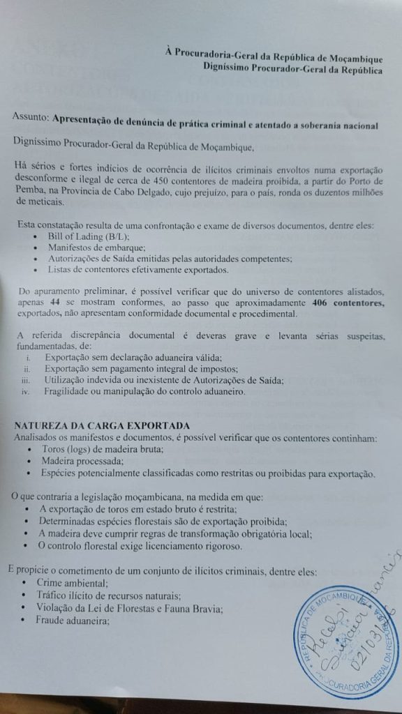 Uma denúncia anónima submetida expõe um suposto esquema de exportação ilegal de madeira no Porto de Pemba, província de Cabo Delgado, que terá lesado o Estado em cerca de 200 milhões de meticais. De acordo com o documento, a que a nossa redacção teve acesso, 406 contentores de madeira terão sido exportados sem a devida correspondência documental, num universo aproximado de 450 contentores movimentados.
