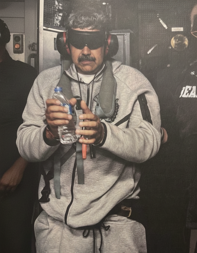 A imagem que agora corre o mundo não mostra o habitual fato formal ou a camisa de estilo revolucionário. No momento em que as forças norte-americanas executaram a incursão em Caracas — descrita como um “ataque de grande escala” — Maduro foi surpreendido e detido enquanto trajava um fato de treino cinzento da Nike, a icónica marca norte-americana, o que acrescenta uma camada de profunda ironia simbólica ao desfecho da sua liderança. Os pormenores da fotografia revelam o rigor da operação de transporte, mostrando Maduro com o cabelo desalinhado e o seu característico bigode, vestindo o conjunto desportivo cinzento que se tornou a sua última farda em solo venezuelano.